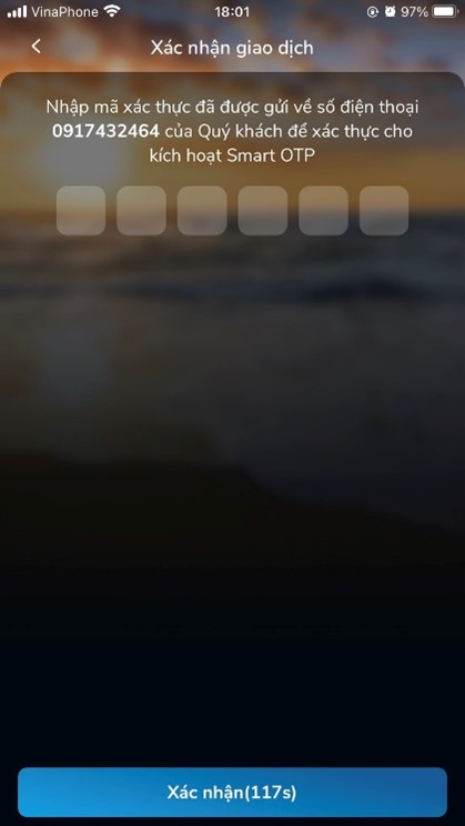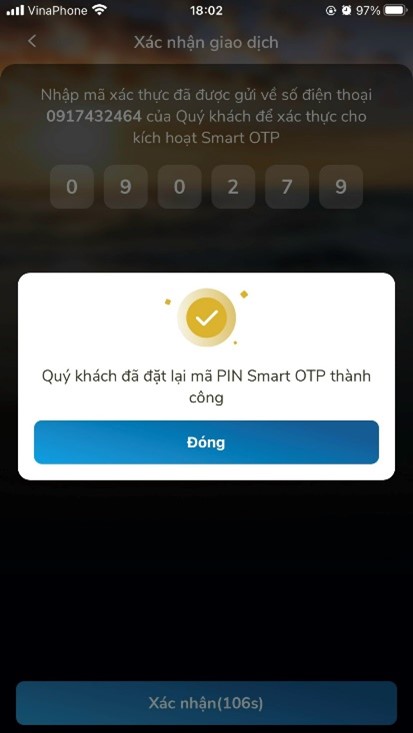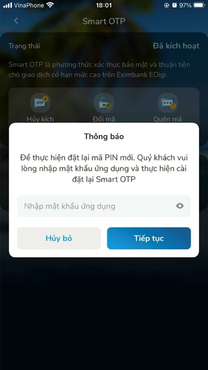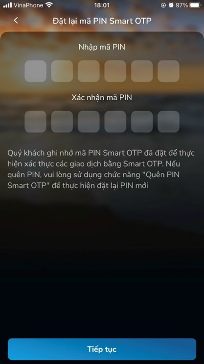 Tại màn hình cài đặt Soft OTP > Nhấn quên mã PIN > nhập mật khẩu ứng