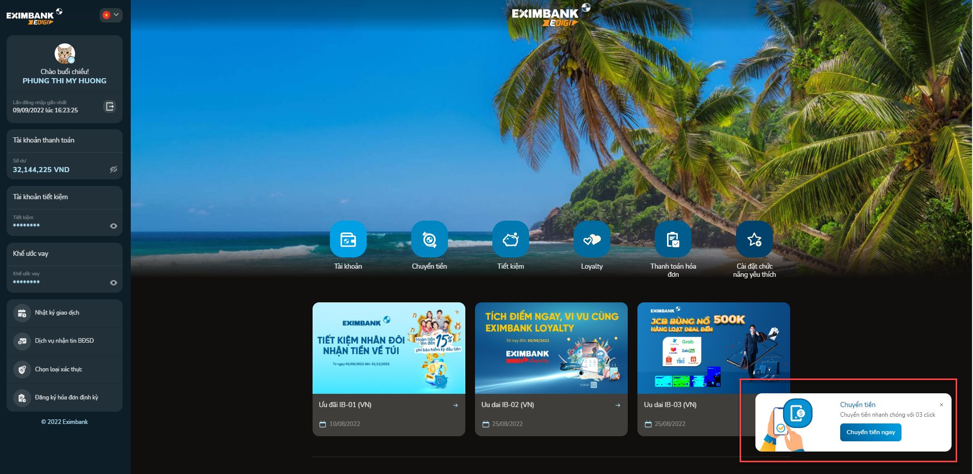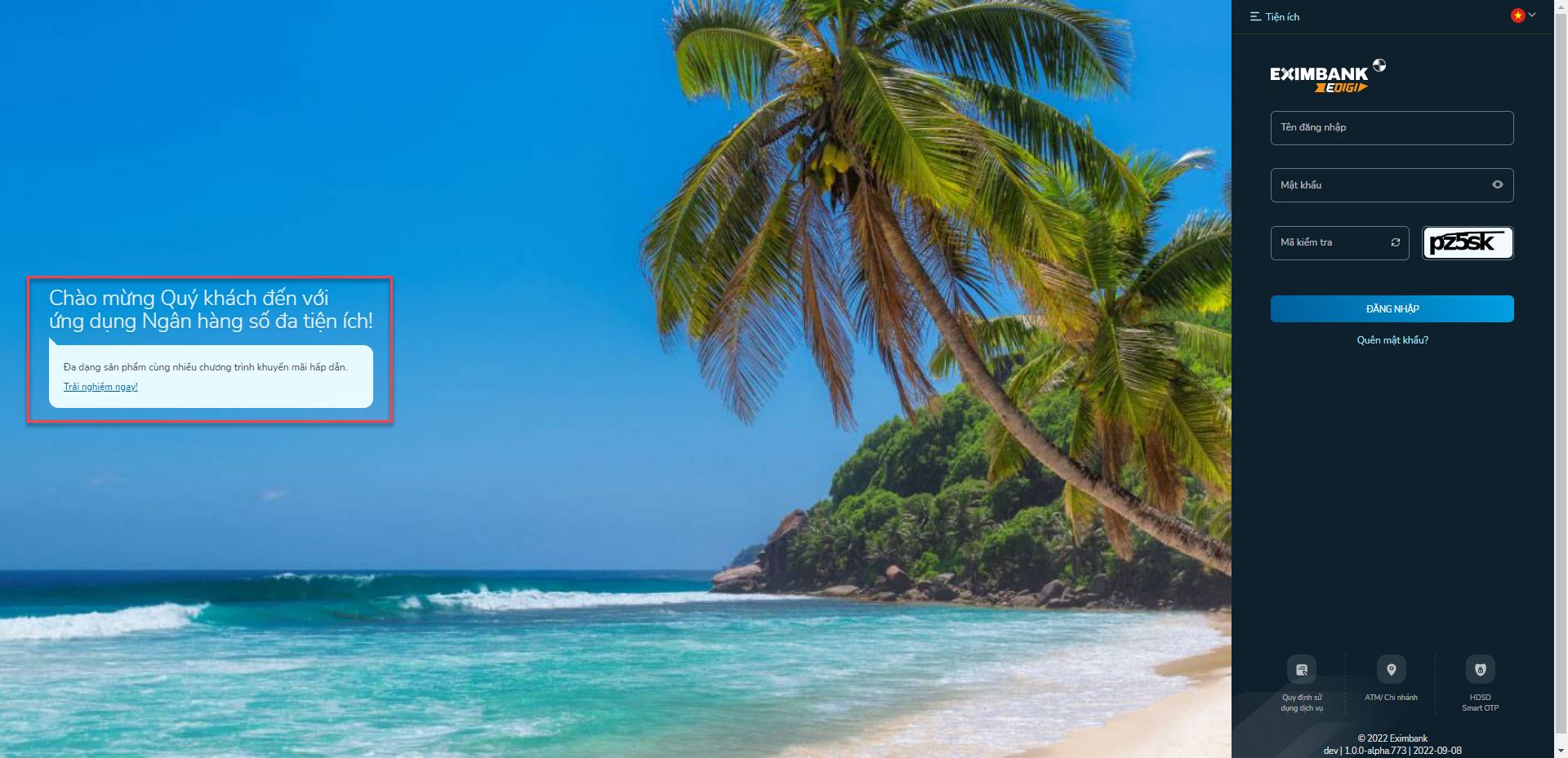 Bước 1: Truy cập website Internet Ngân hàng số Eximbank Edigi, hệ thống hiển thị thông tin dẫn dắt.