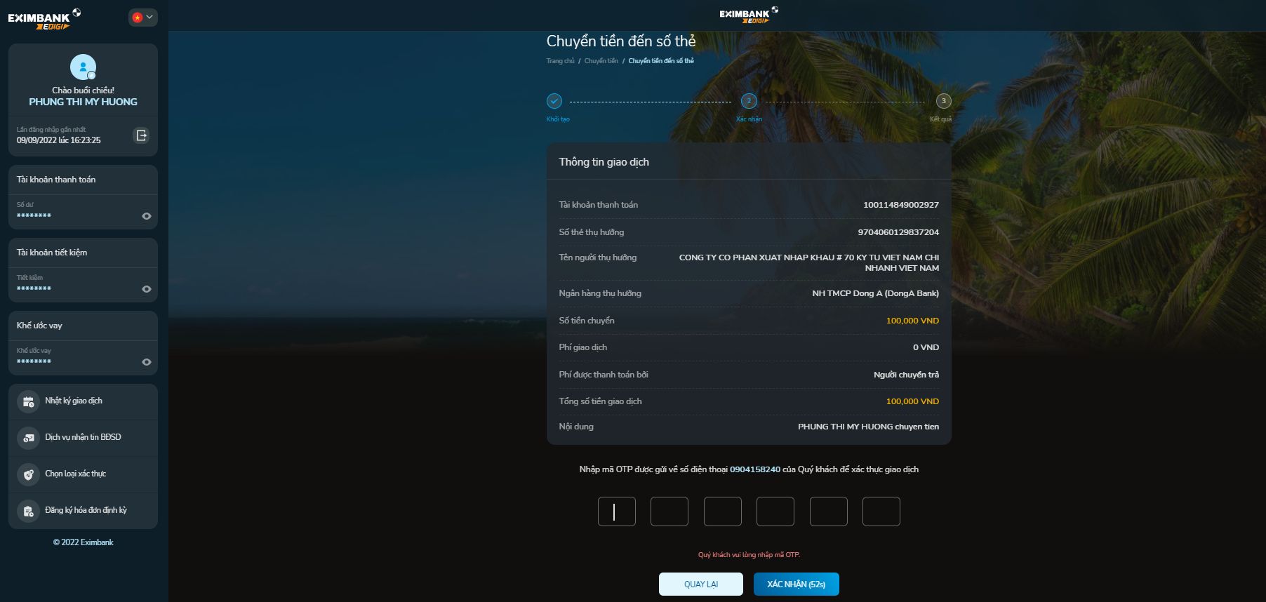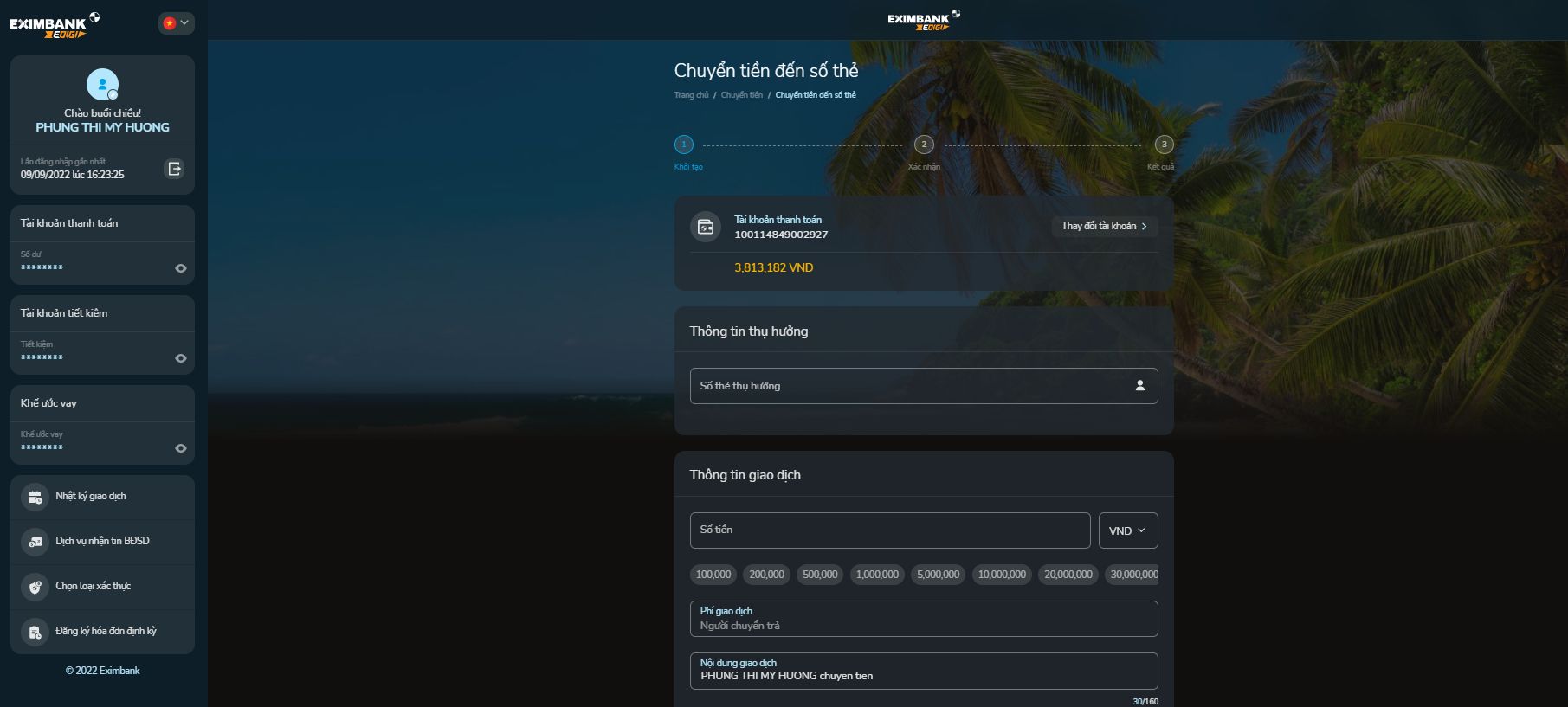 - Chọn/Nhập Thông tin giao dịch (Số tiền + Nội dung giao dịch)