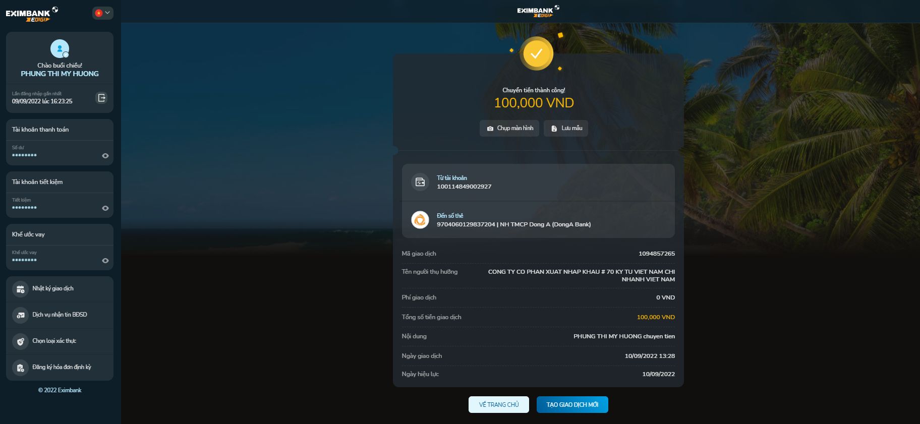 Bước 4: Hiện màn hình Kết quả giao dịch thành công.