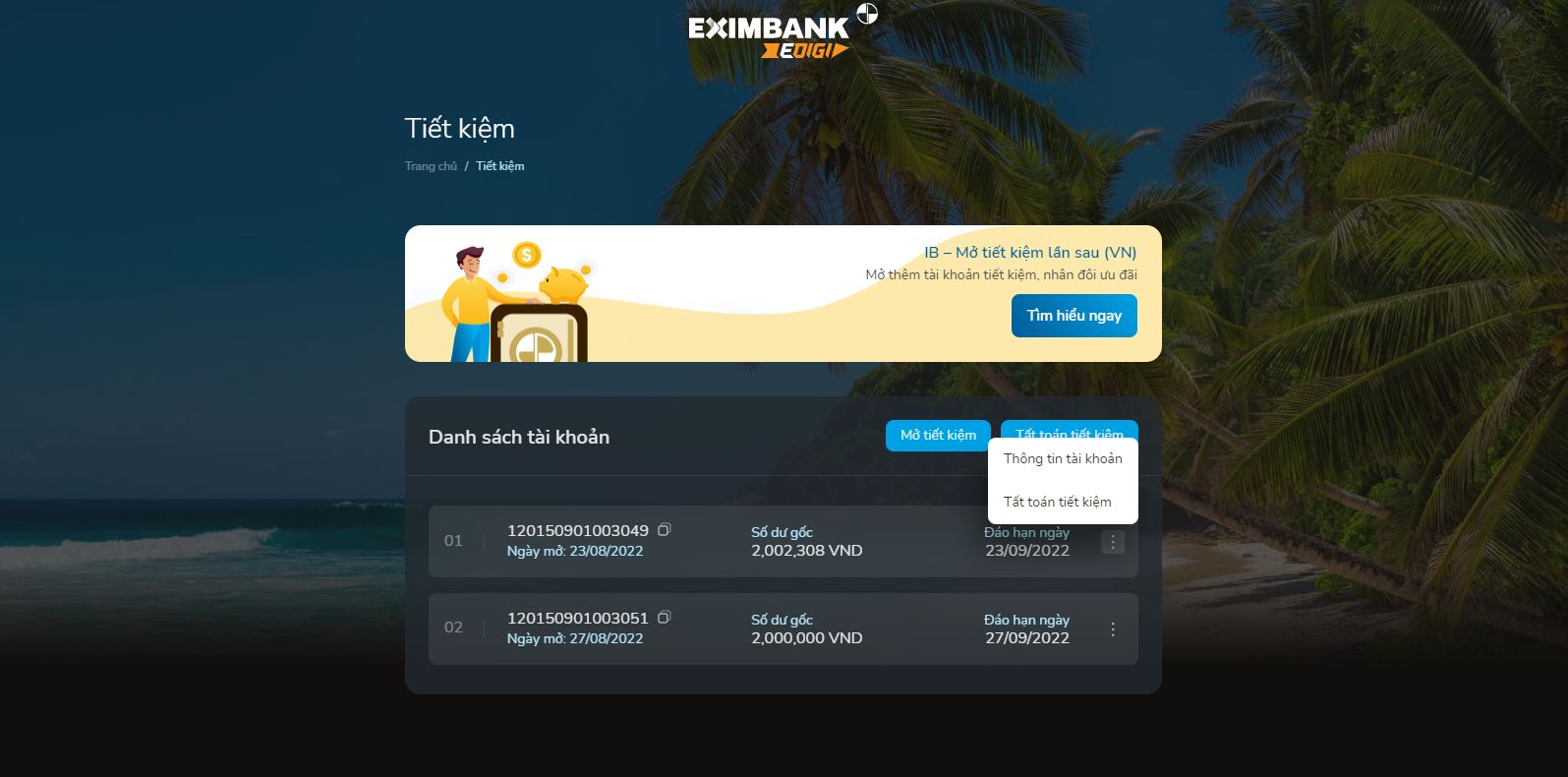 Chọn vào icon 3 chấm trên 01 tài khoản tiết kiệm và thực hiện:
