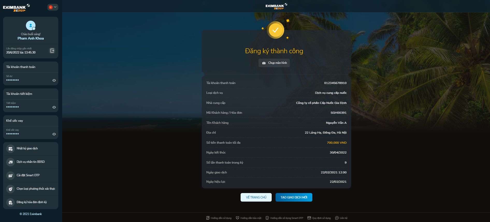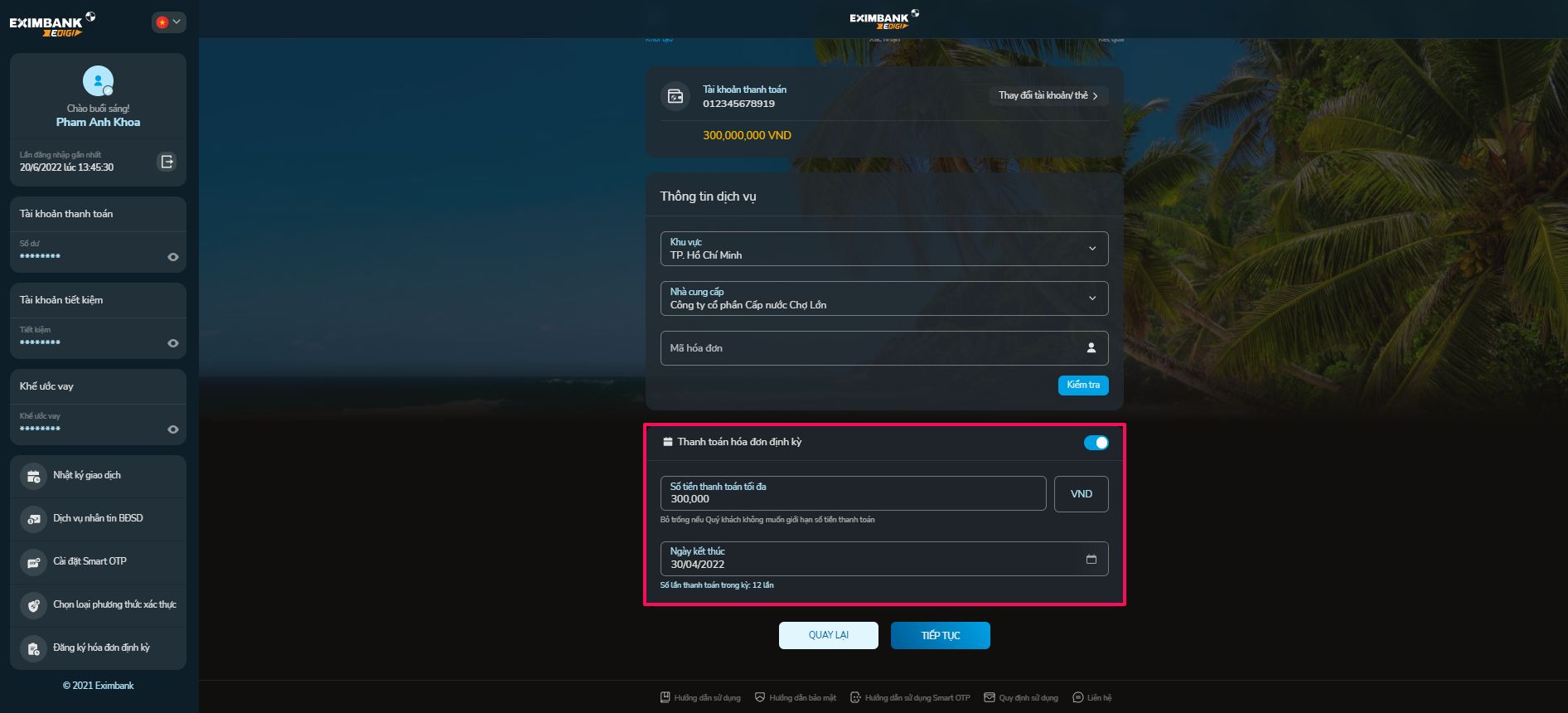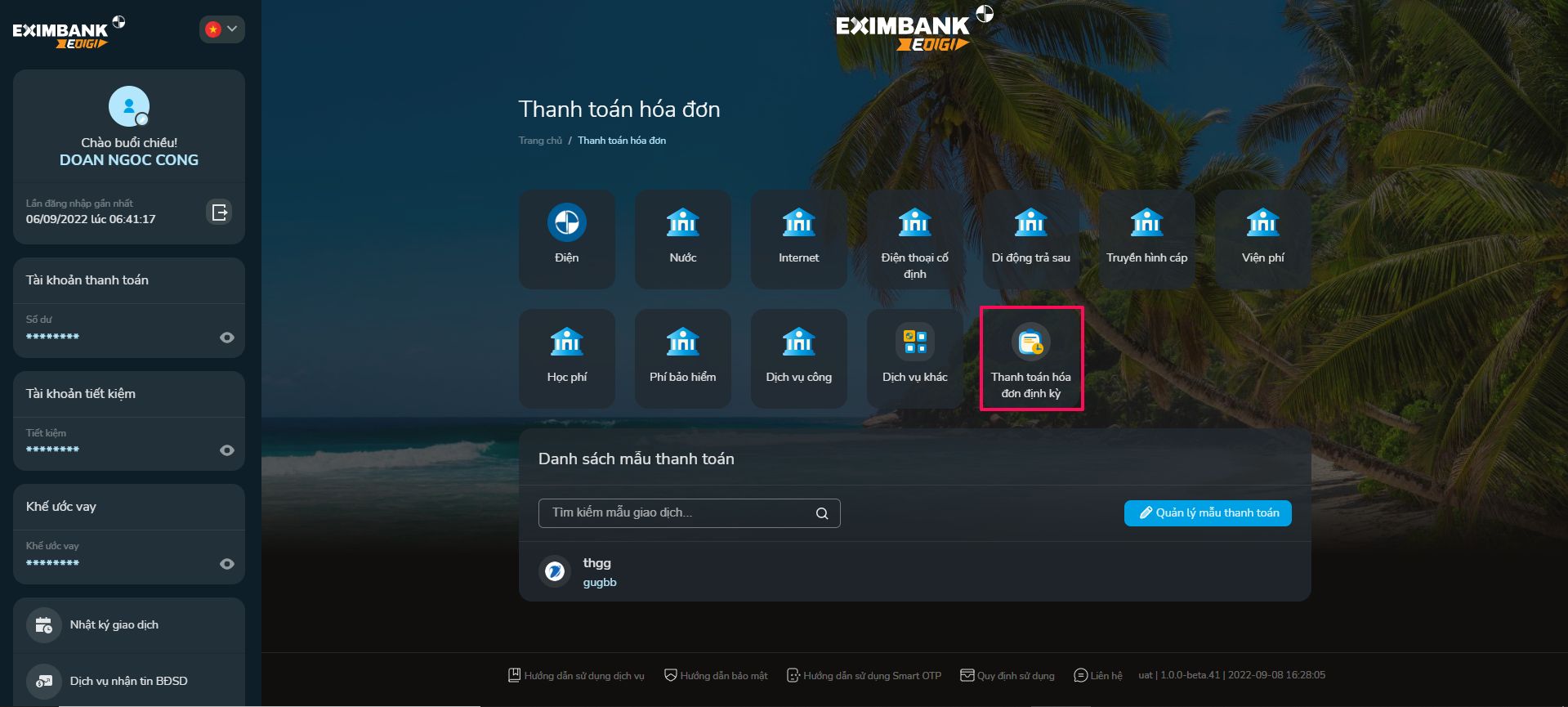 - Bước 4: Kiểm tra thông tin thanh toán hóa đơn định kỳ đã đăng ký: Trang chủ → chọn Thanh toán hóa đơn → chọn Thanh toán hóa đơn định kỳ: kiểm tra danh sách hóa đơn đã đăng ký