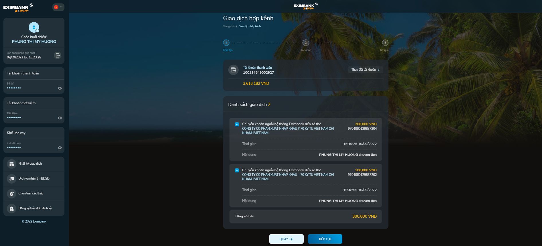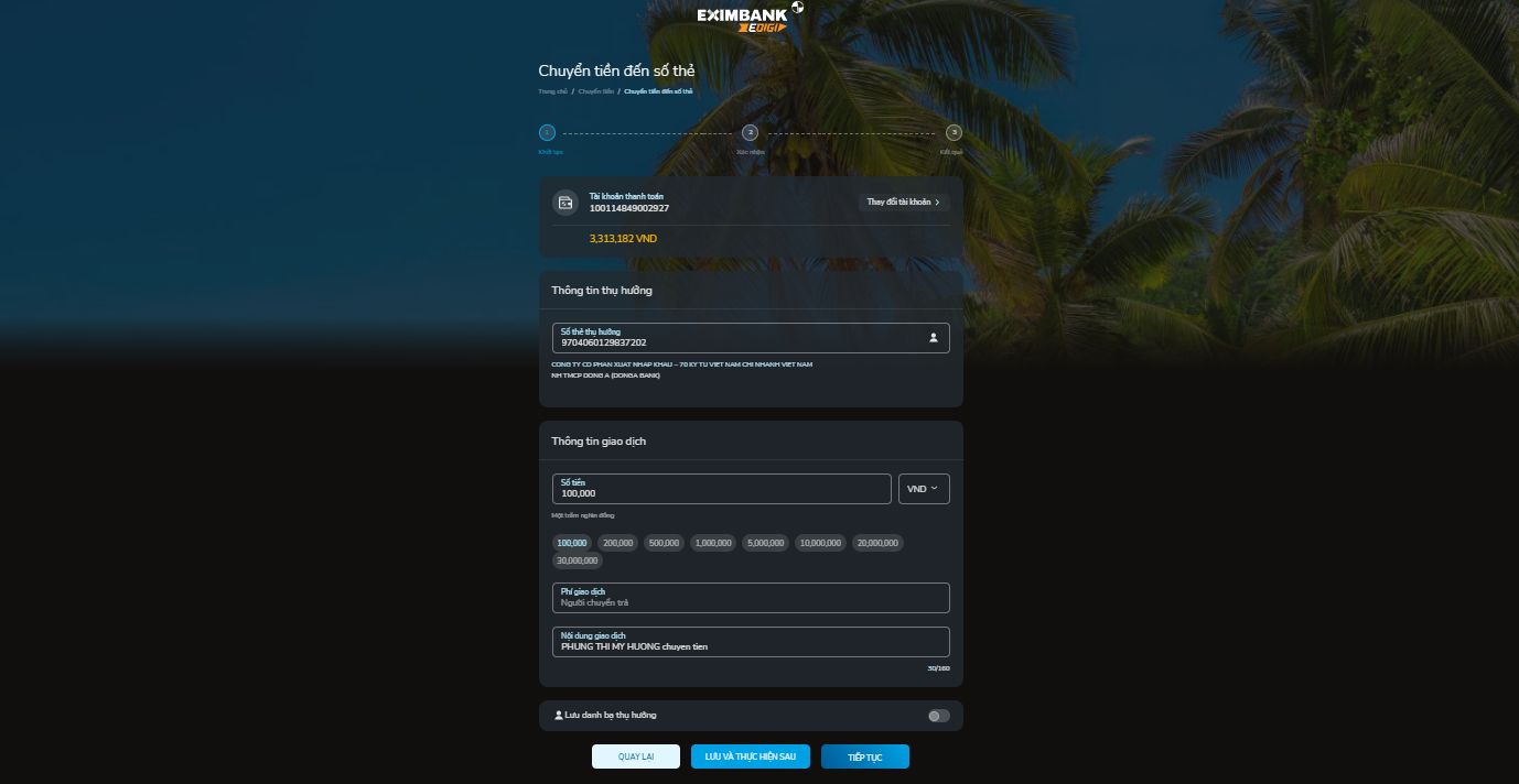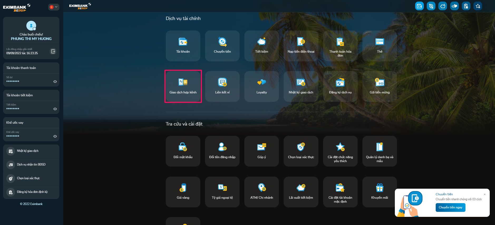 - Chọn 01 loại Chuyển tiền có hỗ trợ giao dịch hợp kênh