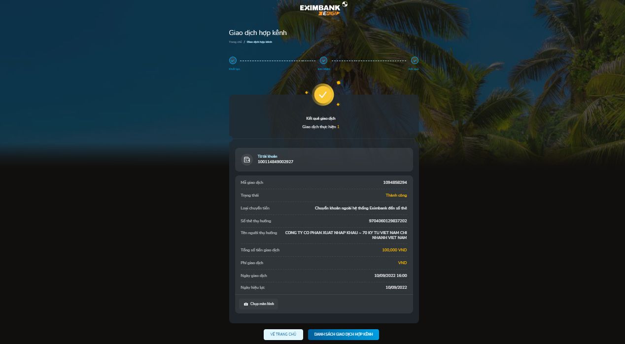 - Kiểm tra GD đã khởi tạo: tại màn hình Trang chủ → chọn Giao dịch hợp kênh.