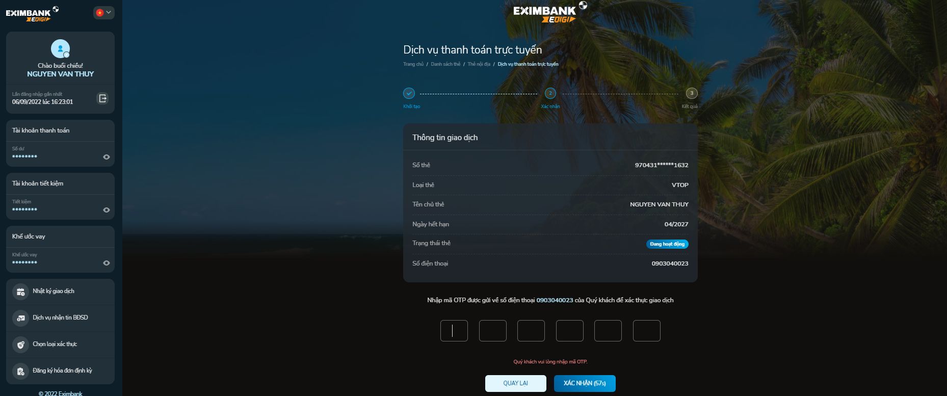 - Nhập mã OTP gồm 6 số được gửi về số điện thoại của khách hàng