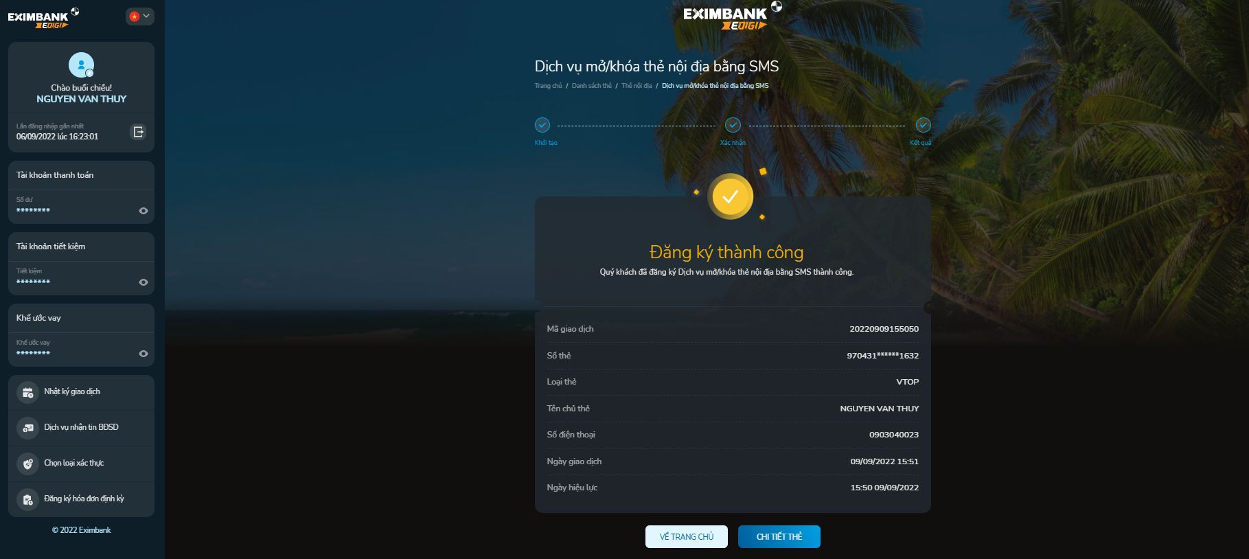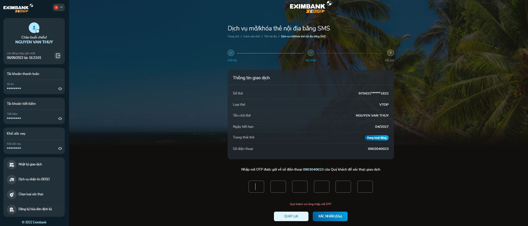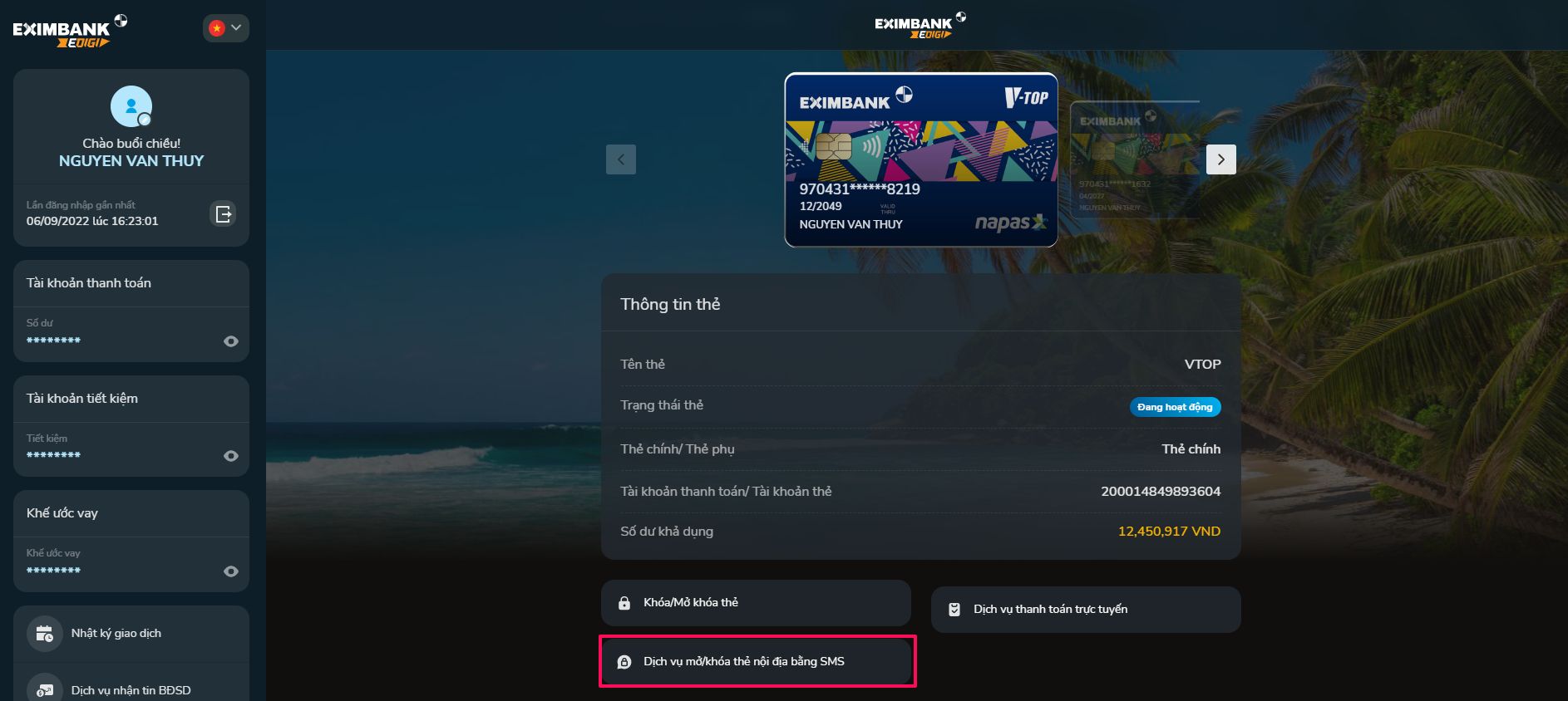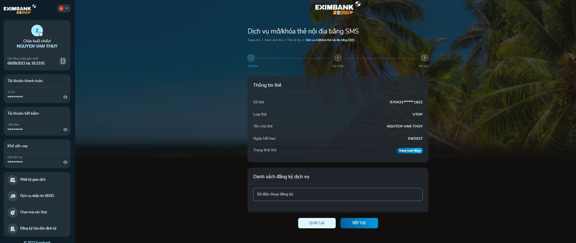 Bước 2: Màn hình dịch vụ Mở/khóa thẻ nội địa bằng SMS
