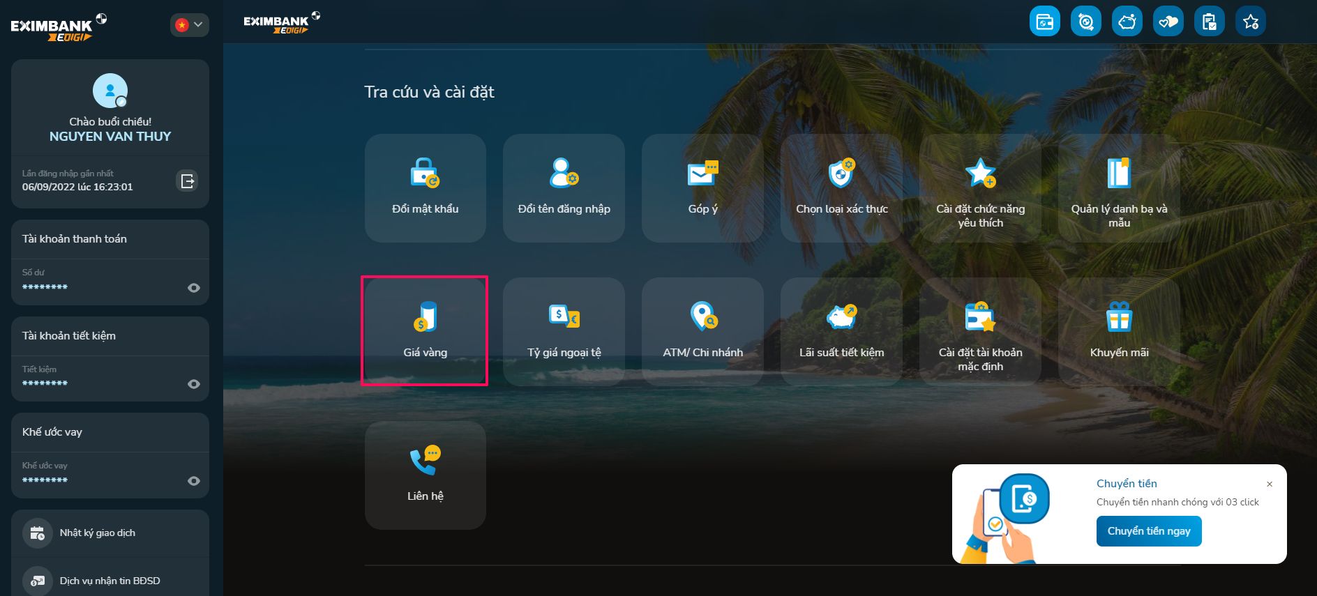 Bước 1: Trang chủ Tại màn hình Trang chủ, nhấn chọn chức năng Giá vàng → Mở tab Tỷ giá ngoại tệ và giá vàng trên trang chủ Eximbank