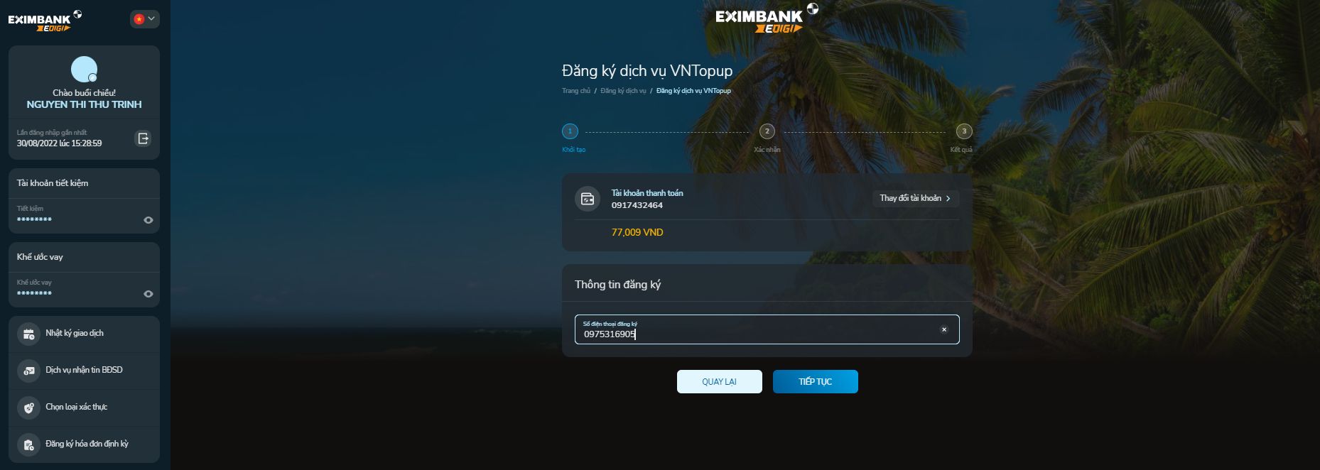 - Tiếp tục: ấn để tiếp tục quy trình đăng ký dịch vụ VNTopup