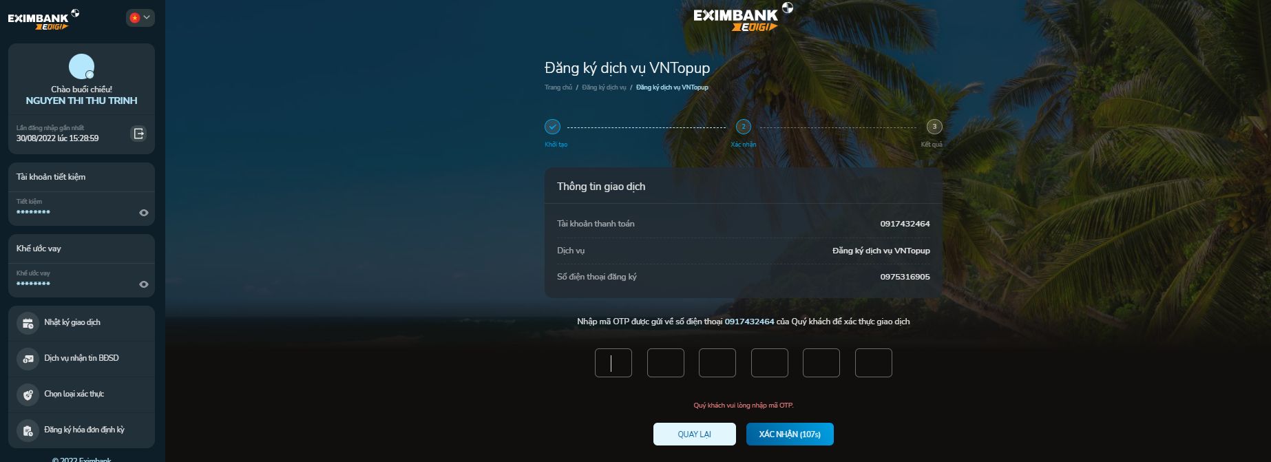 - Nhập mã OTP gồm 6 số được gửi về số điện thoại của khách hàng