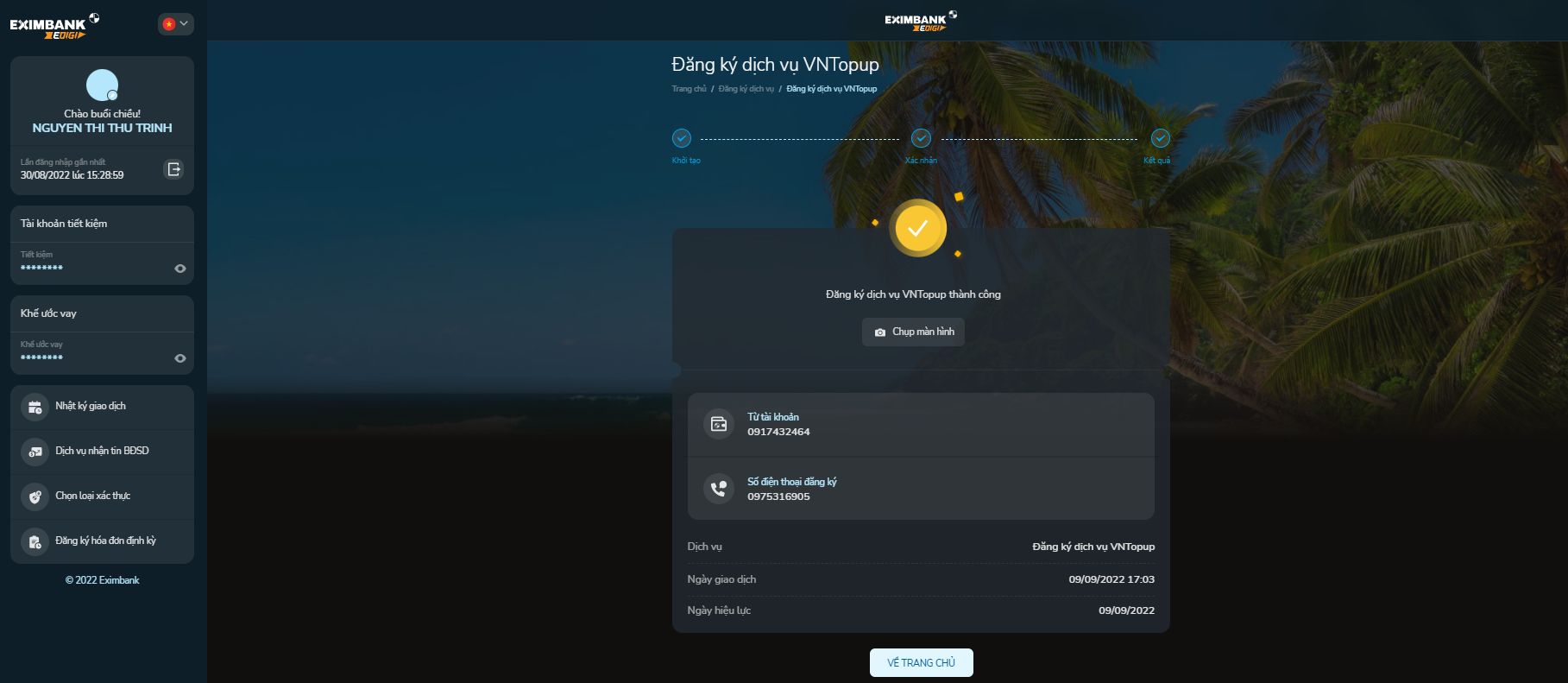 Bước 4: Hiện màn hình Kết quả giao dịch thành công