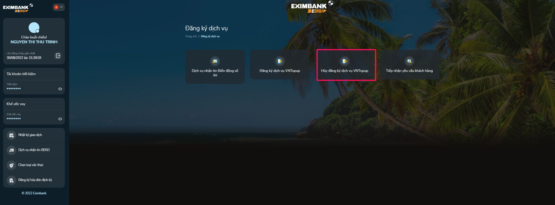 Tại Trang chủ → Nhấn chọn Đăng ký dịch vụ → Nhấn chọn Hủy đăng ký dịch vụ VNTopup