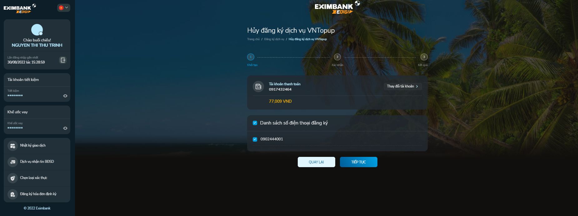 - Tiếp tục: ấn để tiếp tục quy trình hủy đăng ký dịch vụ VNTopup