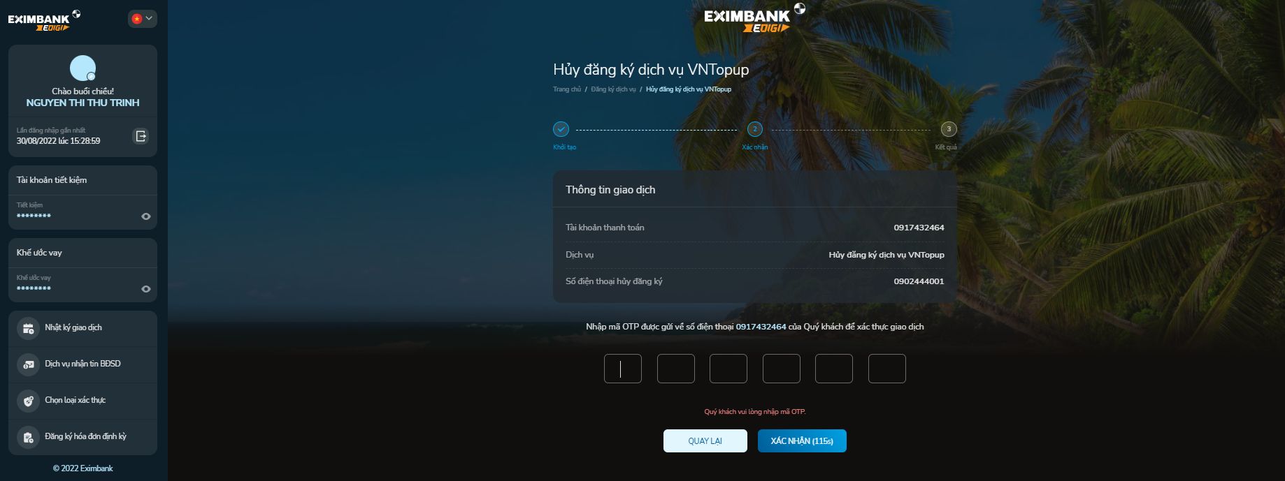 - Nhập mã OTP gồm 6 số được gửi về số điện thoại của khách hàng