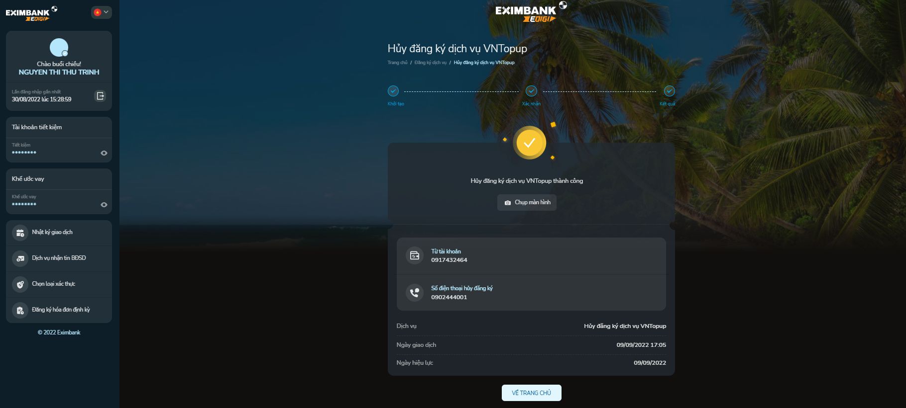 Bước 4: Hiện màn hình Kết quả giao dịch thành công