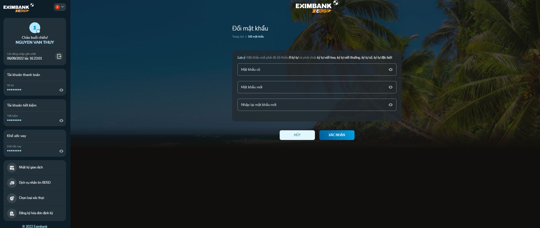 - Tại màn hình Đổi mật khẩu, khách hàng tiến hành nhập mật khẩu cũ, mật khẩu mới và nhập lại mật khẩu mới