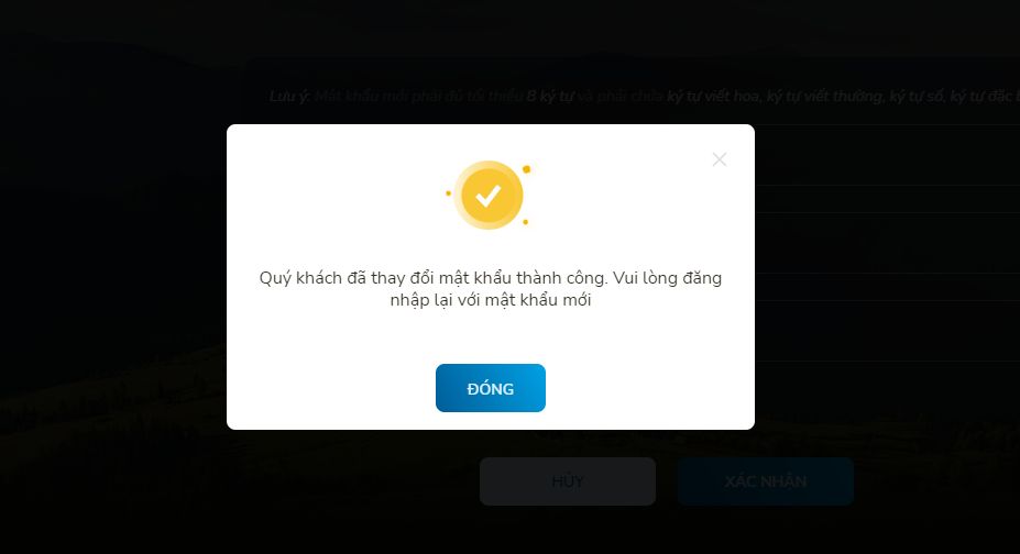 Đóng: ấn để kết thúc quy trình đổi mật khẩu. Tài khoản sẽ tự động đăng xuất và yêu cầu khách hàng đăng nhập lại bằng mật khẩu mới