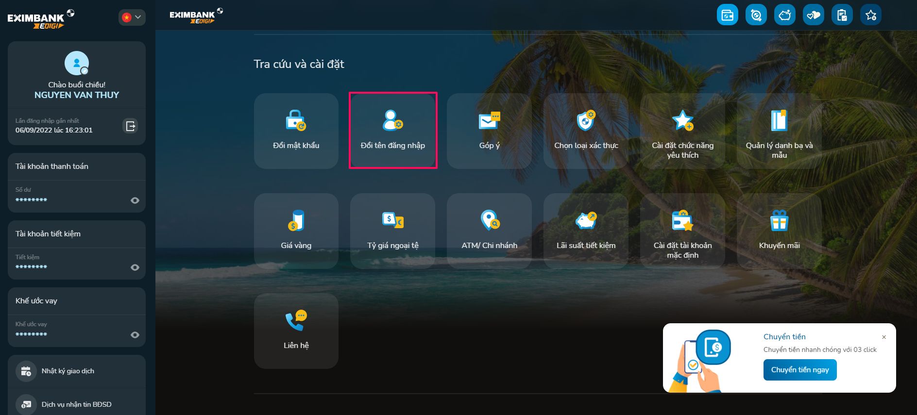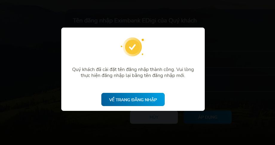 - Về trang đăng nhập: ấn để quay về màn hình đăng nhập và khách hàng đăng nhập lại bằng tên đăng nhập mới