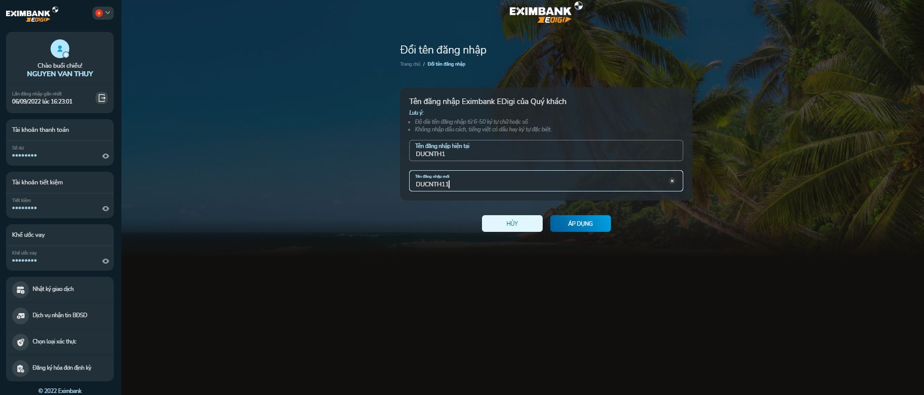 - Áp dụng: ấn để tiếp tục quy trình đổi tên đăng nhập