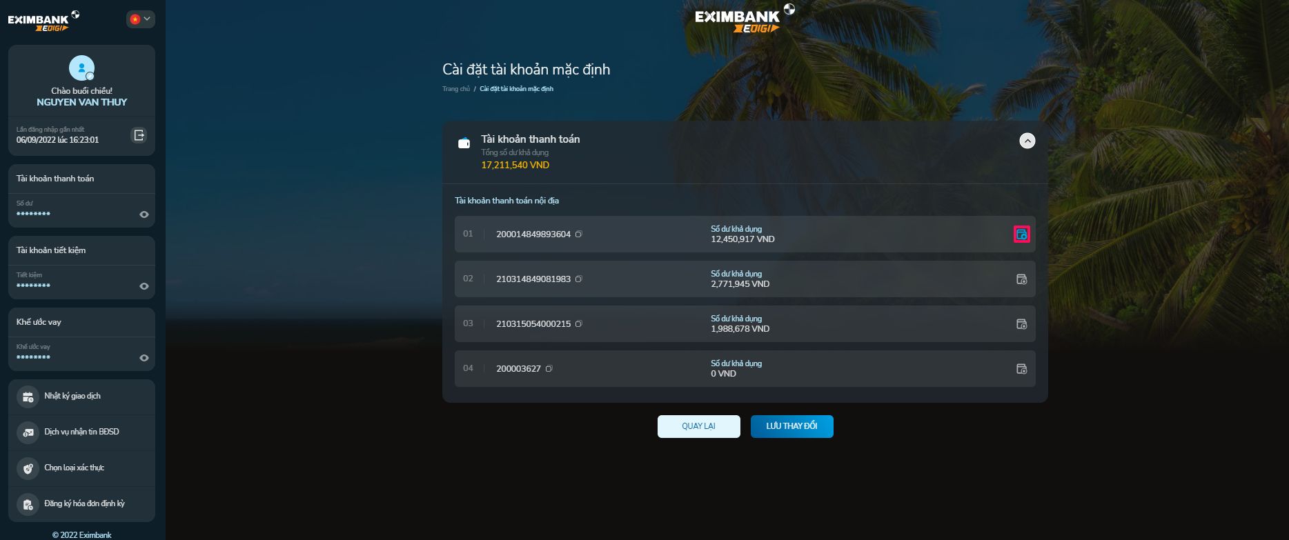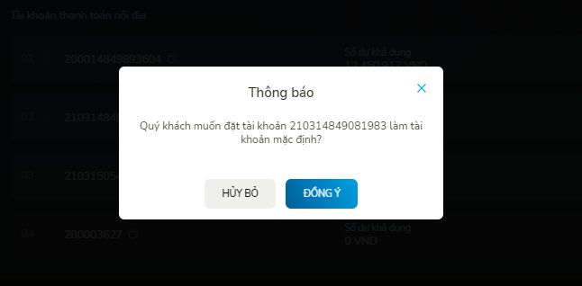 - Khách hàng nhấn vào biểu tượng ở cuối tài khoản thanh toán để chọn tài khoản thanh toán mặc định cho các giao dịch trên OMNI Banking